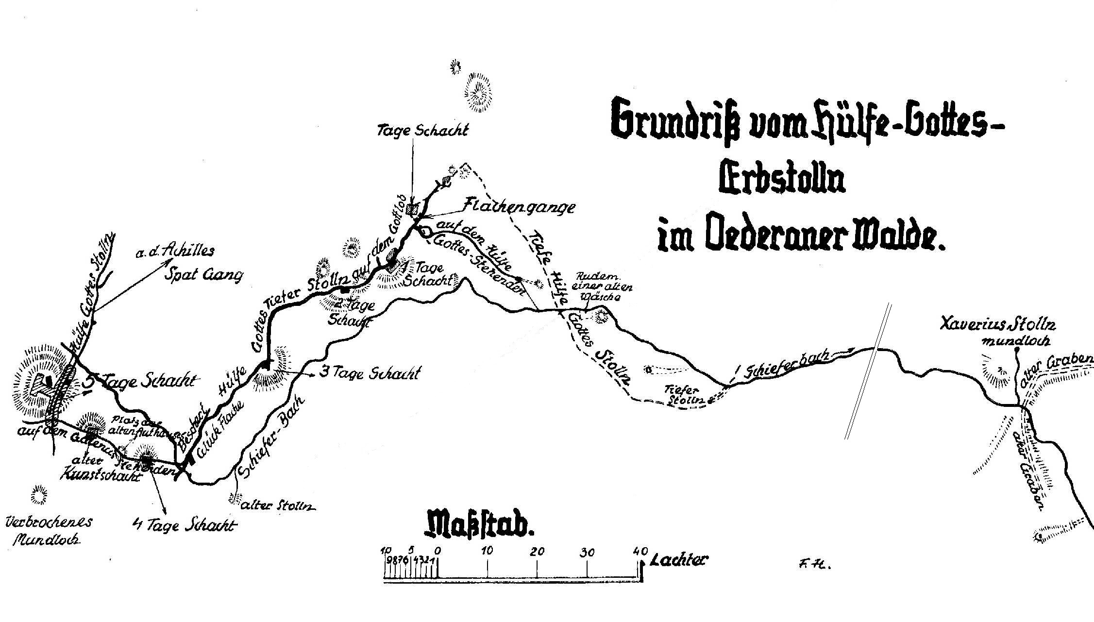 In eine erdgeschichtlich recht interessanten Gegend führt uns der Weg durch das Schieferbachtal. Von saftigen Wiesen umgeben und von waldigen Höhen eingeschlossen, liegt unser herrliches Falkenauer Bad. Seine selten schöne Lage und sein kristallklares Wasser haben es in kürzester Zeit zu einem der betuchtesten Naturbäder des östlichen Erzgebirges gemacht. Verfolgen wir das Bächlein, das sich in das Falkenauer Bad ergießt, weiter aufwärts, so kommen wir sehr bald an eine stark pulsierende Quelle, der reichlich ockerfarbenes Wasser entströmt. Dem aufmerksamen Beobachter werden in dieser Waldgegend Bodenvertiefungen und Erhebungen auffallen, die die Natur von sich aus unmöglich so geschaffen haben kann. In allernächster Nähe diese Quelle stößt man im Bergabhang in eine höhlenartige Öffnung, die sich bei näherer Betrachtung als ein Stollenmundloch entpuppt und oberhalb der Quelle ist ein Erdhügel, der ganz deutlich den Eindruck einer Grubenhalde macht. Überall, wohin wir den Fuß setzen, stoßen wir auf Reste eines längst erloschenen Bergbaus, und der Name „Zechengrund“ sagt es uns schon: Wir befinden uns in mitten von Stollen, Halden und Schächten, Zeugen einer längst vergangenen Bergbauherrlichkeit. Das Schieferbachtal liegt im Grenzgebiet der Erzgebirgischen Phyllitformation und des Frankenberg-Hainichener Zwischengebirges, die in einer westlich des Schieferbaches in einer N-S verlaufenden Verwerfung aneinander stoßen. Hierbei fallen die Gesteinsschichten von beiden Seiten des Tales, vermutlich in Folge der bei der Gebirgsbildung entstandenen Aneinanderpressung, nach dem Bach zu ein, die Gesteine des Frankenberger Zwischengebirges nach Ostsüdost, die der Erzgebirgischen Formation mit 10-30 Grad nach Westen. Dass bedeutende Gebirge bildende Kräfte dabei mitgewirkt haben, zeigen die stark gepressten Gesteinsschichten in dem kleinen Steinbruch gegenüber dem Naturbad Falkenau. Die Gesteine sind im Gebiet des Frankenberg-Hainichener Zwischengebirges im wesentlichen chloritische Glimmerschiefer, die Gesteine der Erzgebirgischen Schieferformation bestehen im Gebiet aus Phylliten (dünnblättriger kristalliner Schiefer) und zwar aus Granat-albitphylliten (Natronfeldspat- Schiefer) und Quarzphylliten. Die Granat-albitphylliten wurden früher vielfach zu Dachschiefern, Brunnenplatten und dergleichen gebrochen (Steinbrüche nordöstlich von Schönerstadt). Östlich und südöstlich des Schieferbachtales lagern auf den Phylliten Reste der Steinkohlenformation von Flöha aus, und zwar Konglomerate, Sandsteine und Schiefertone, die ihresgleichen wieder bedeckt sind von Zeisigwalder Porphyrtuffen rotliegenden Alters (Bruch an der Oederaner Staatsstraße). Zeichnet sich das Gebiet schon durch seinen gestörten geologischen Aufbau gegenüber anderen aus, so treten neben diesen Verwerfungsspalten noch Erzgänge auf, die, ehemals offene Spalten, ihre Entstehung Absätzen von aus der Tiefe gekommenen Thermallösungen verdanken. Diese Gänge setzen im oberen Schieferbachtal, west-nordwestlich der Karolinenhöhe, im Granat-albitphyllit auf und sind von unseren Altvordern bergmännisch abgebaut worden. Sie gehören zum größten Teil der so genannten kiesig- blendigen Bleierzformation an. Die oben genannten, im oberen Schieferbachtal aufsetzenden Gänge sind seit Mitte des 16. Jahrhunderts von mehreren nur dem Namen nach noch bekannten Gruben auf Silber- und Bleierze bebaut und durch den tiefen Hilfe-Gottes-Stollen gelöst worden. Bezüglich der Wasserversorgung des Gebietes wird man annehmen müssen, das im Schieferbach vorhandene Wasser an der Stelle, wo Schneise 38/39 den Bach schneidet, in die darunter liegende Grubenhaue gezogen wird und durch einen derselben den tiefen Gottes-Hilfe-Stollen, abgeführt wird. Betrachtet man die verschiedenen Grubenhalden und Pingen, so zeigen die knapp 300m unterhalb des schon erwähnten Wendepunktes an der Schneise 39/40 auf dem linken Gehänge gelegene Pingen eine eigentümliche Erscheinung. Es finden sich dort ein Zug von Halden mit 4 Einsturztrichtern (2.bzw. 1.Tagesschacht). Die nördlichste und kleinste Pinge ist mit klarem Wasser angefüllt. Das Wasser entstammt einer Quelle, die am Pingenrand, jedoch noch in der Pinge entspringt. Gleich neben dieser Pinge findet sich eine weitere, die mit der kleineren in Verbindung steht. In regenreichen Zeiten muss diese Pinge Wasserzuschüsse von der kleineren erhalten. Nach dem ehemaligen 1.Tagesschacht zu findet sich eine weitere Pinge. Etwa 130m unterhalb der Schneise 38/39 tritt am rechten Ufergehänge eine starke Quelle aus. Der Quellenpunkt ist identisch mit dem verbrochenen Stollenmundloch des oben genannten ehemaligen tiefen Gottes-Hilfe-Stollen. Die Bergamtsakten geben hierüber noch Auskunft. Unter dem 20. Oktober 1798 wird beurkundet, dass auf dem Spatgang vom Morgen her Wasser einbrechen, die auch in trockenen Zeiten gegen 1.zweiböhrige Röhre Wasser stark sind. Ein Gutachten sagt am 16. Mai 1822, dass die Stollenwasser gegen 60 Kubikfuß stark sind. Ein Fahrbericht vom 20. April 1836, dass auf mehreren Punkten des Stollens starke Wasser förstweise zuliefen. Die Untersuchung des Gebietes hat gezeigt, dass in einem gestörten Gebirge Quellen augenscheinlich verschiedener chemischer Zusammenhänge auftreten, insonderheit Quellen, die durch äußerst starke Eisenockerabsätze auszeichnen.